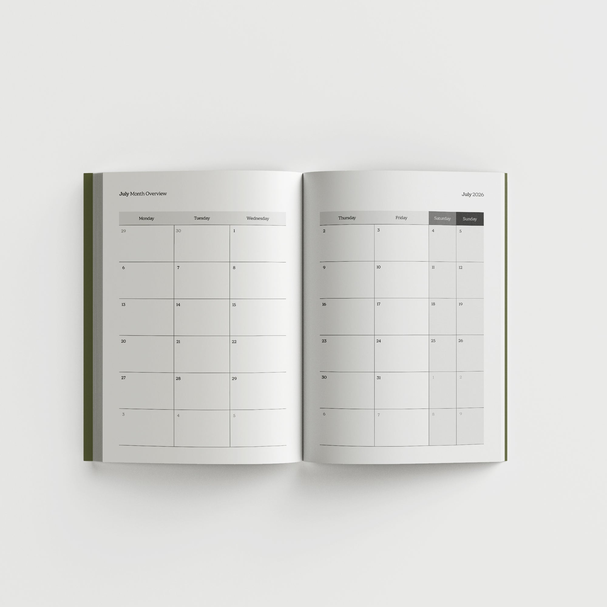 - Month and Week-to-view double-page spreads