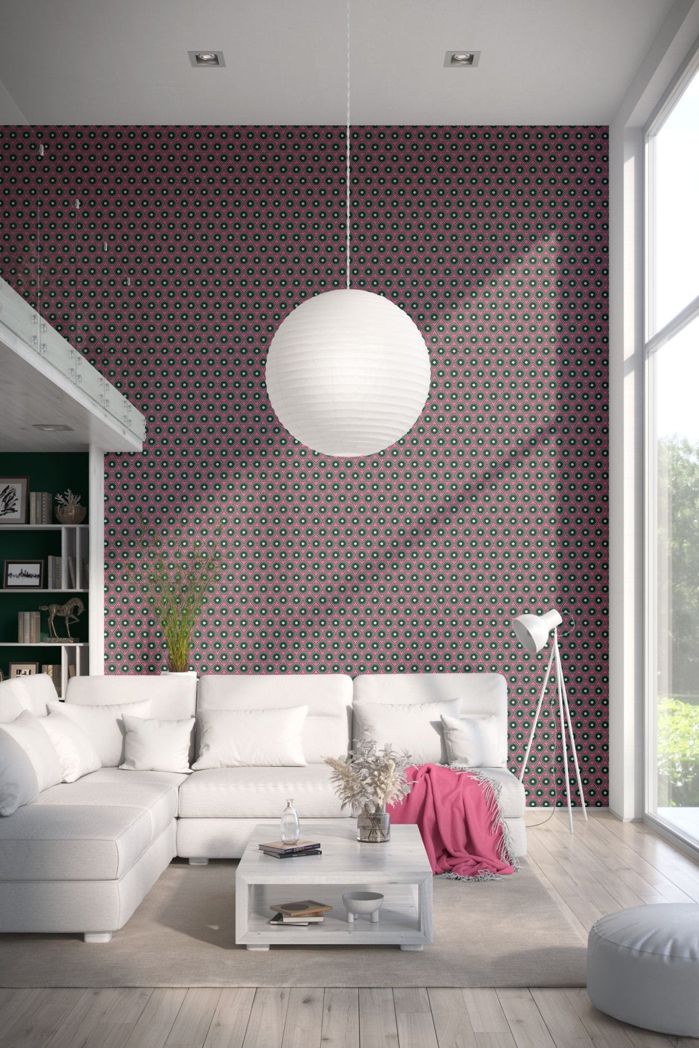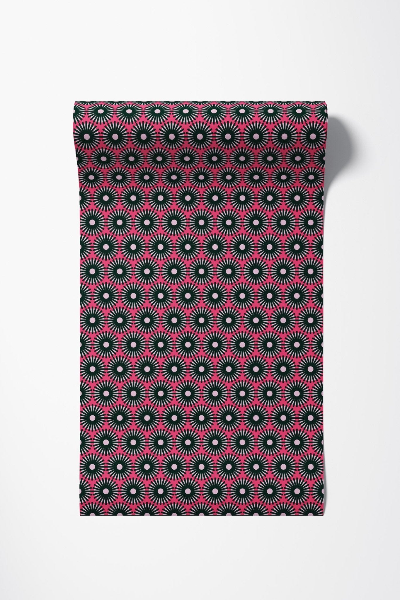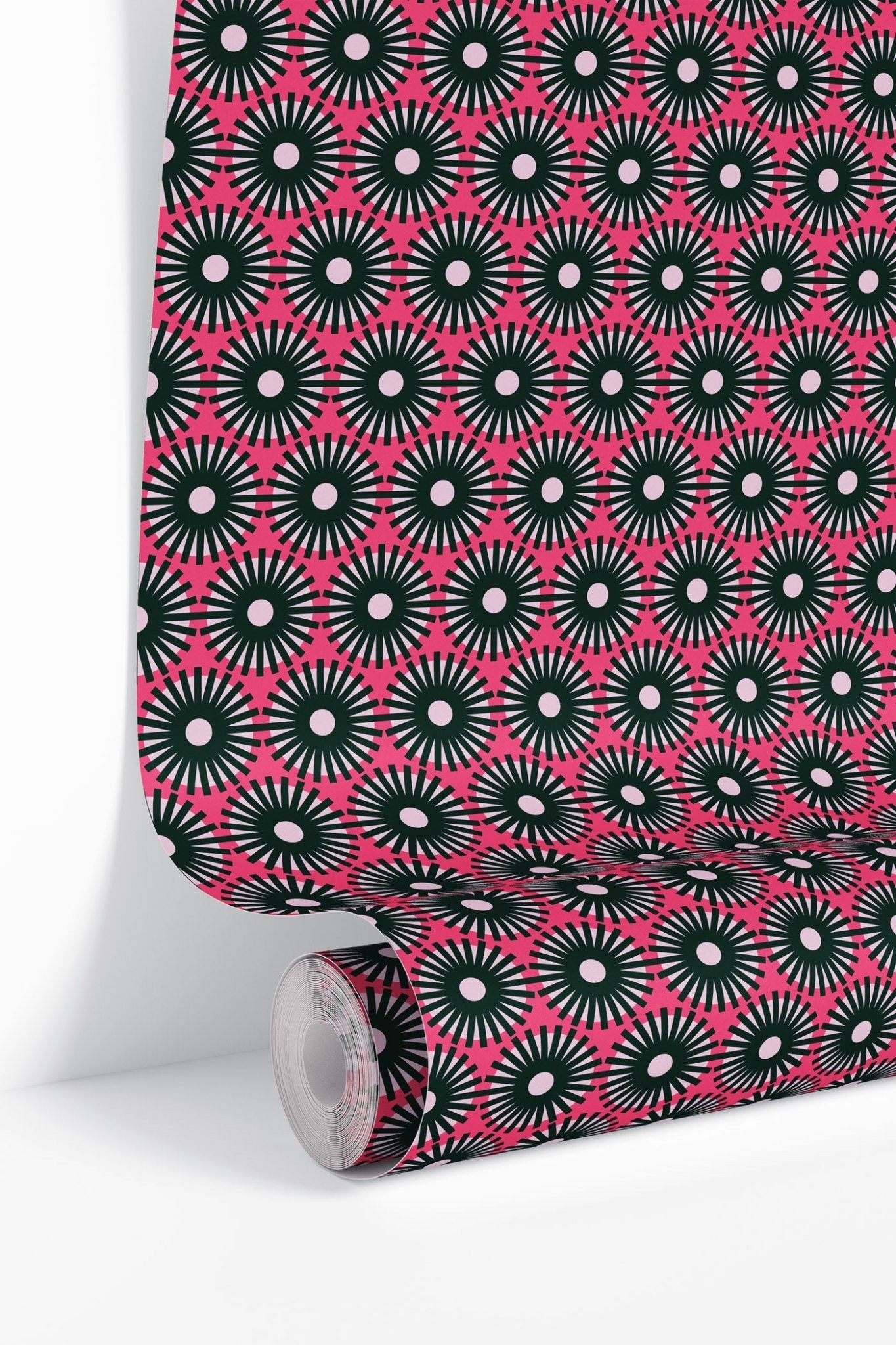 ‘Festival 5’ wallpaper from our Re-Editions Collection (Volume 1). A modern graphical repeat pattern in pink and green.